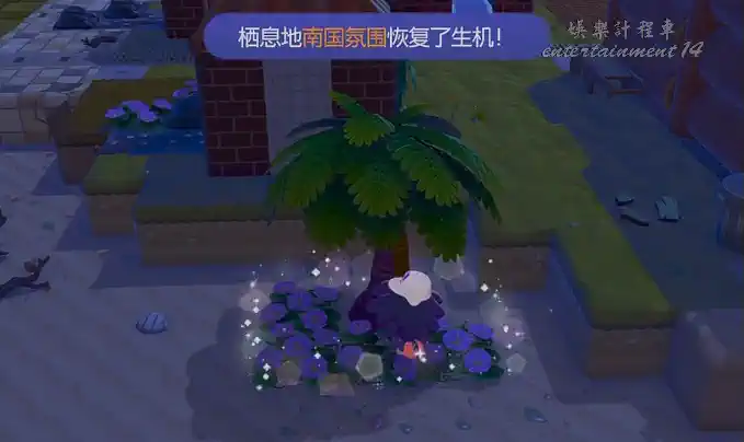 Q:放好了但沒有跳出「南國氛圍」字樣怎麼辦? A:請逐項檢查:花朵是否緊密相連(不能有空隙)、棕櫚樹是否在花叢的正上下左右方向(不能是斜角)、是否放在合適的地形上。調整後離開區域再走回來看看。