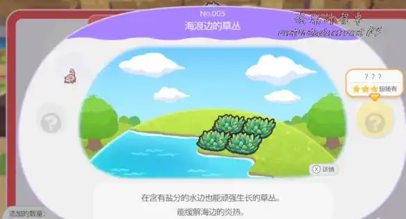放置規範:4 格草叢以 2×2 形式連續排列,2 格海水緊鄰草叢放置(上下左右方向皆可,斜對角無效),必須鋪設在沙灘或海灘地形之上。