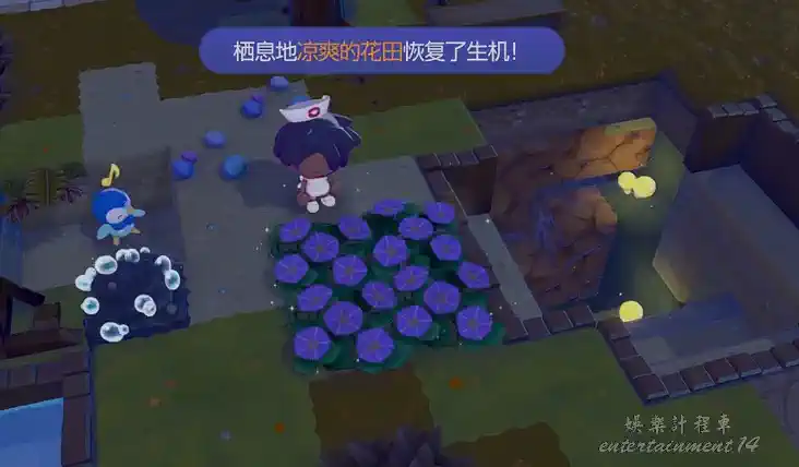 運用水槍對地圖上的乾花進行澆灌,使其恢復為野生花