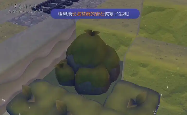 畫面上會顯示「長滿苔蘚的岩石/MossyBoulder」字樣,並出現苔蘚覆蓋的視覺效果